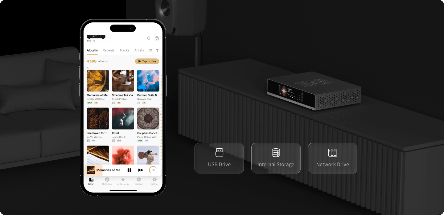 Подключив к USB-порту MS-1c внешний CD-привод, можно воспроизводить записи с компакт-дисков и легко копировать треки CD в цифровые файлы. Это позволит сочетать качество звучания CD с удобством управления стриминговым музыкальным контентом. Преодолевая ограничения физического носителя, MS-1c делает музыку по-настоящему вездесущим и прекрасным спутником вашей жизни.