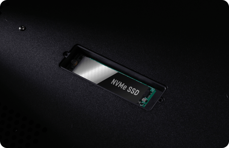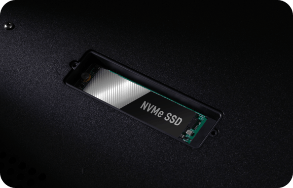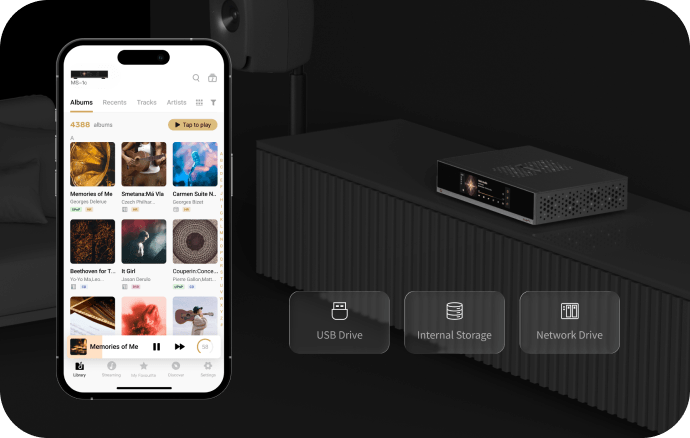 Слот для SSD в нижней части корпуса с интерфейсом NVMe позволяет легко увеличить ёмкость хранилища для музыкальных файлов. Специально разработанный малошумный независимый источник питания для SSD существенно превосходит обычные компьютерные решения. Внутреннее хранилище доступно по локальной сети, что упрощает управление библиотекой. Устройство также может функционировать как NAS, предоставляя доступ к музыке другим стримерам в сети.