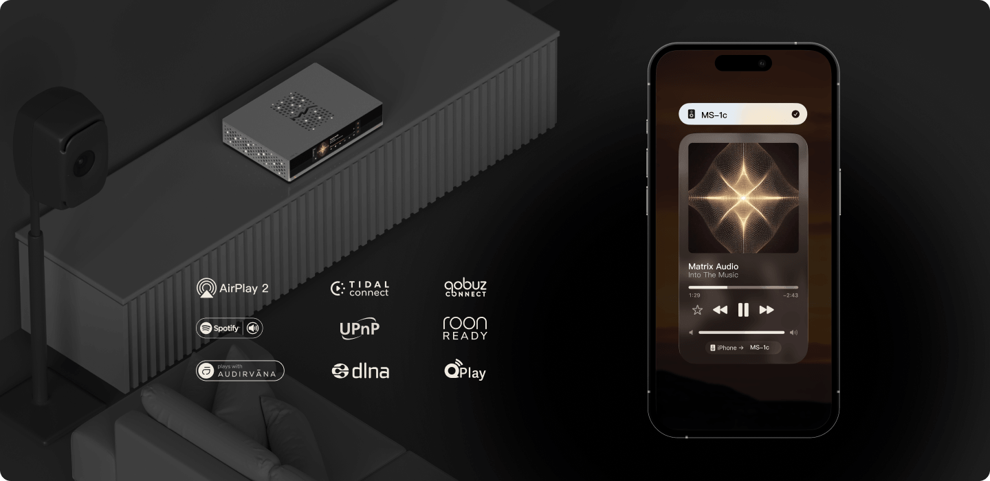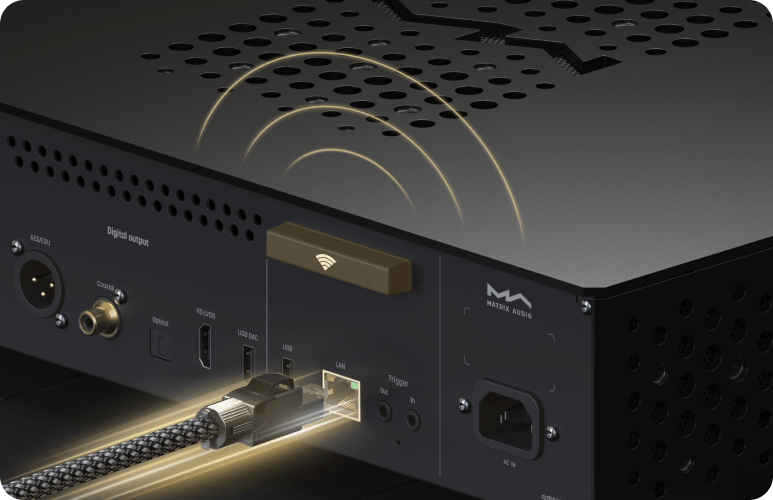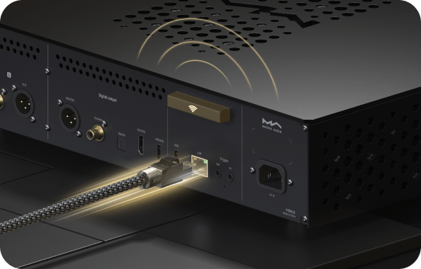 MS-1c поддерживает подключение к сети Ethernet-кабелем или беспроводное, стандарта Wi-Fi 6. Гигабитный Ethernet обеспечивает надёжное соединение для воспроизведения PCM или DSD-сигнала высокого разрешения. При отсутствии возможности обеспечить кабельное соединение, гибкой и удобной альтернативой станет Wi-Fi 6.